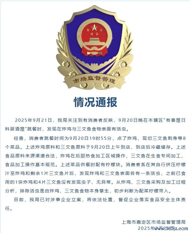 【大河财立方音信】9月22日,上海市嘉定区阛阓监督照顾局发布通报称,9月21日,嘉定区阛阓监督照顾局存眷到有破钞者反应,9月20日晚在本辖区“有喜屋日料居酒屋”就餐时,发当今炸鸡与三文鱼食物名义有活虫。